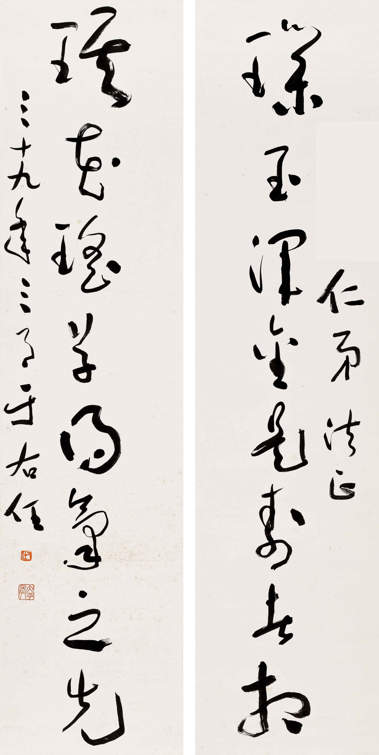于右任(1879–1964),字右任,號太平老人,為中國近現代史上傑出的書法家與愛國志士,長年擔任監察院院長。其書法以魏碑為基,雄渾剛健、古拙中見逸趣,自成一格。這幅對聯中,字字見力,線條酣暢,渾然天成,展現了于右任晚年書風的蒼勁遒勁。
